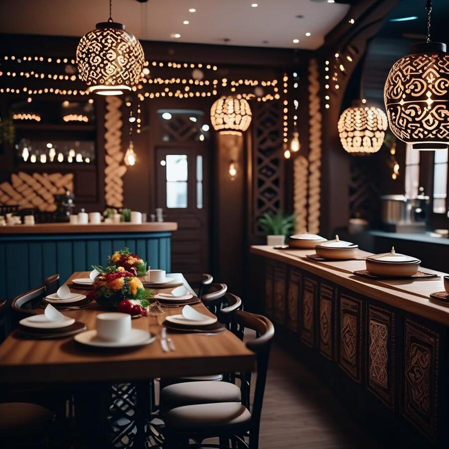 для изображения интерьера применяю стиль Image Style — photographic промпт: restaurant with ethnic kitchen of caucasus people. use ornament and color