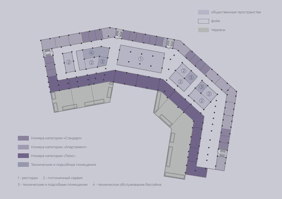 Гостиничные номера делятся на 4 категории: «Стандарт», «Апартамент», «Люкс», «Пентхаус».