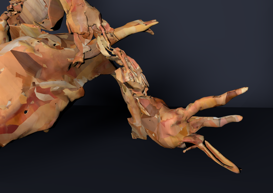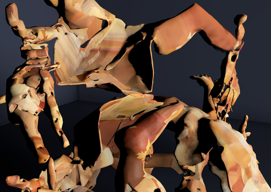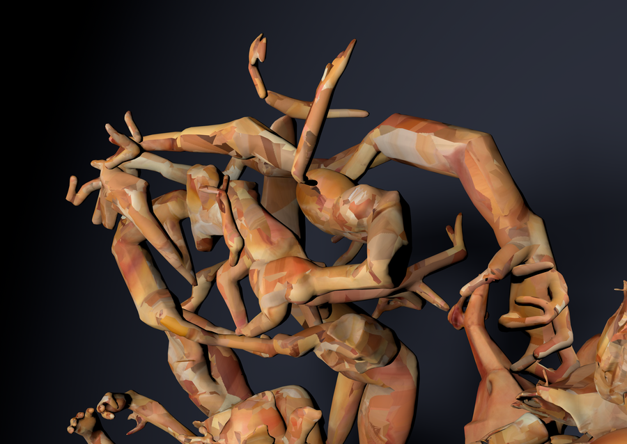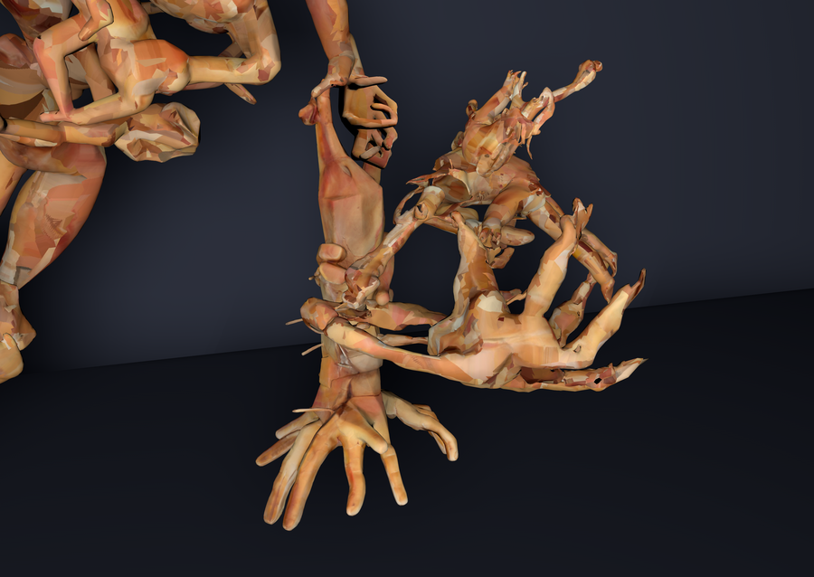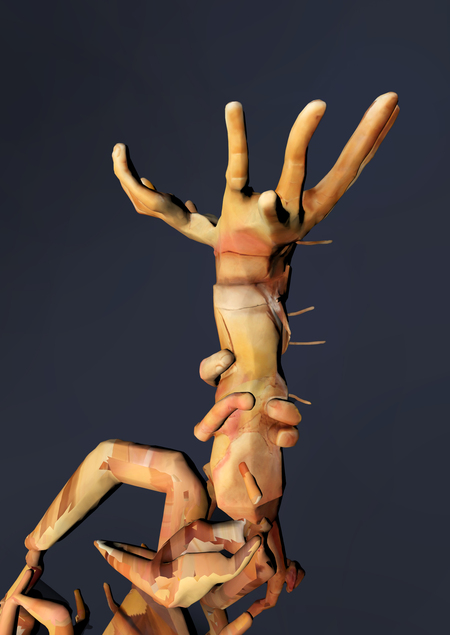 Я перевожу в объем свои бумажные эскизы, на которых скреплены конечности, руки и ноги, при помощи нейросети, а далее дорабатываю эти скульптуры, создавая из них сложные и запутанные композиции.