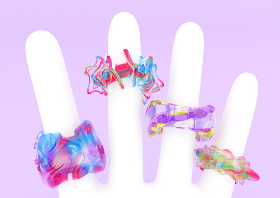 1. Промпт: Create a square pattern print illustration (130×130 cm, 150 dpi) featuring abstract, colorful glass rings with a smooth, gradient, vibrant appearance, with uneven not very big matte transparent glass parts and with a lot of big vibrant particles with different uneven rounded and wavy forms. Use saturated, pastel and bright colors such as pink (#FFCADF), purple (#EACFFE), light green (#E6F9B2), light blue (#C3EEFE). Objects should have complicated gradients. The rings should have complicated uneven shapes with gradient fills that blend smoothly between colors. The background should be solid white (#FFFFFF) to enhance the vividness of the elements. Ensure the overall design is modern, playful, and visually appealing, with a clean and abstract aesthetic. lightness. naivety. 3d cycles render. no shadows. space filled with abstract shapes objects