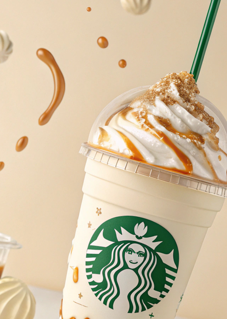 Промпт: 'A starbucks coffee machine in its classic colors floats on a delicate beige background surrounded by whipped cream and caramel. it should look like high-quality 3D'
