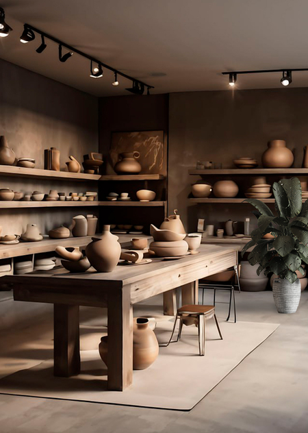 Сгенерированные изображения на сайте Playground AL. Промт: Create a cozy, minimalist pottery studio with modern lighting and wooden furniture. There must be natural lighting.