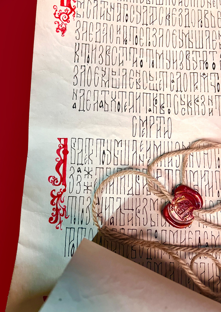 Было желание отойти от обычной книги и поискать что-то ещё. Так, пришла идея написать свиток, где взят фрагмент из Соборного уложения 1649 года.