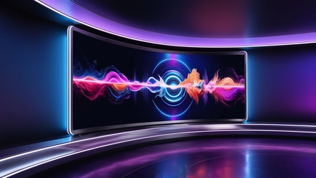 Leonardo.ai, промт: frontal view of the screens in the space of the electronic music museum. in violet-blue shades of color