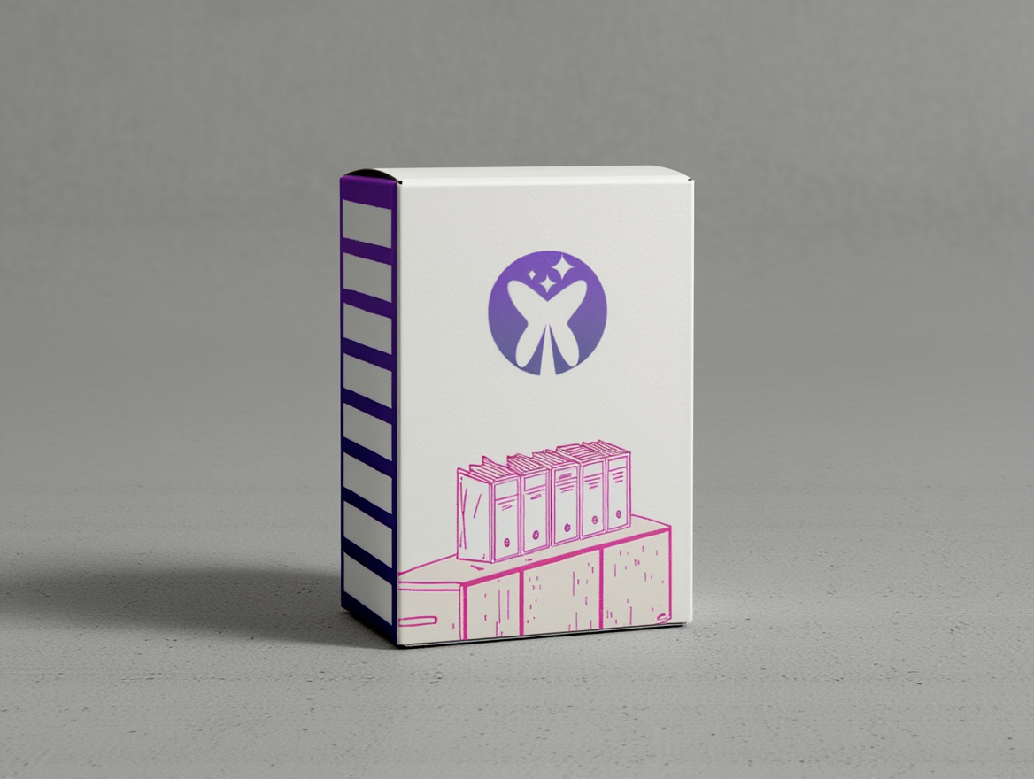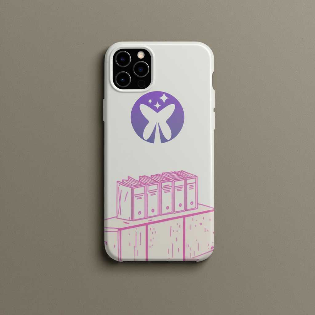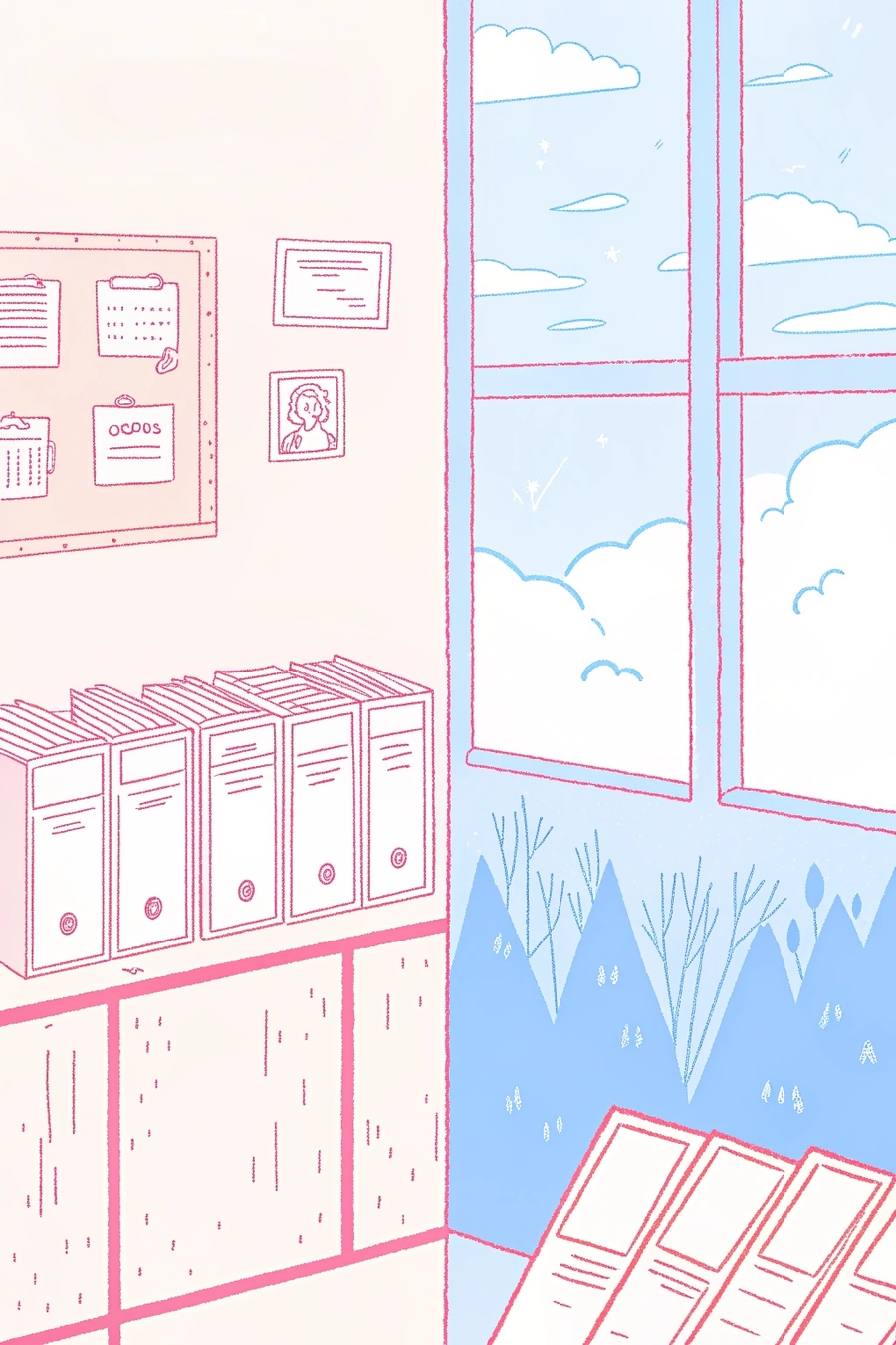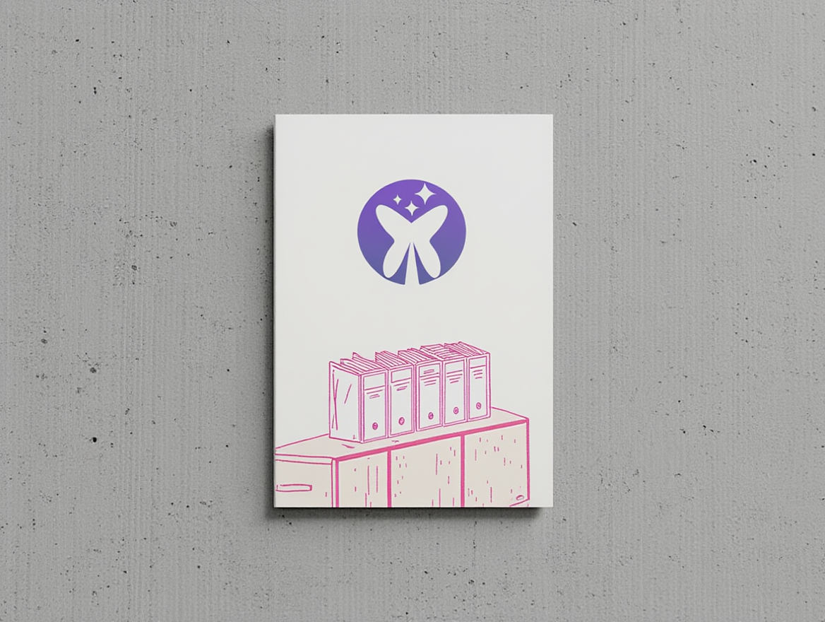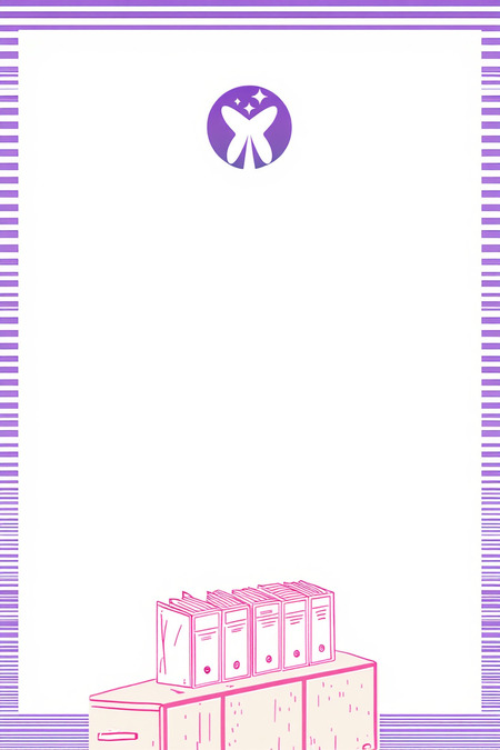 Prompt: a light poster for tooth fairy office with pink lilac colour, documents and folders, teeth, office