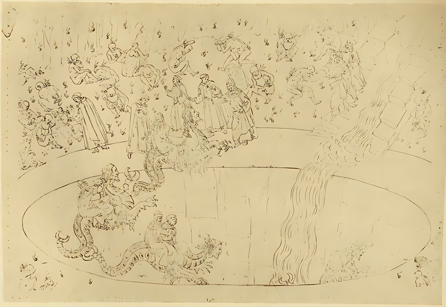 Однако с углублением религиозной рефлексии, усугубленной социальными катаклизмами, эпидемиями Черной смерти и проповедями о неминуемом Страшном суде, образ Ада начинает стремительно усложняться и обрастать плотью ужаса. Эпоха Позднего Средневековья и Проторенессанса превращает его в гигантскую, сложно устроенную машину для возмездия. Решающую роль здесь сыграло влияние «Божественной комедии» Данте Алигьери, чей текст предоставил художникам готовую, детально проработанную картографию преисподней. Ад приобретает четкую архитектуру — многоуровневую концентрическую воронку или неприступную крепость, где для каждого класса грехов предусмотрено особое, символически соответствующее ему наказание. Это наглядно демонстрируют фрески Джотто, где впервые появляется масштабная, систематизированная и населенная активными демонами-палачами вселенная зла, подчиненная своей собственной жуткой логике.