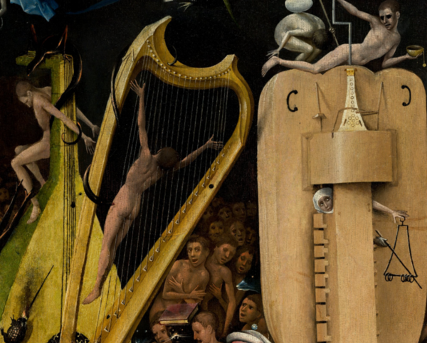 Правая створка триптиха это Ад, где знакомый мир превращен в гигантскую мастерскую пыток. В отличие от традиционных изображений преисподней с ее огнем и смолой, Ад Босха — это сумеречный, холодный и техногенный кошмар, освещенный багровым заревом далеких пожаров. Город на заднем плане, объятый пламенем, отбрасывает зловещее сияние на фантасмагорическую сцену, где небеса более не видны, а пространство замыкается на самом себе.