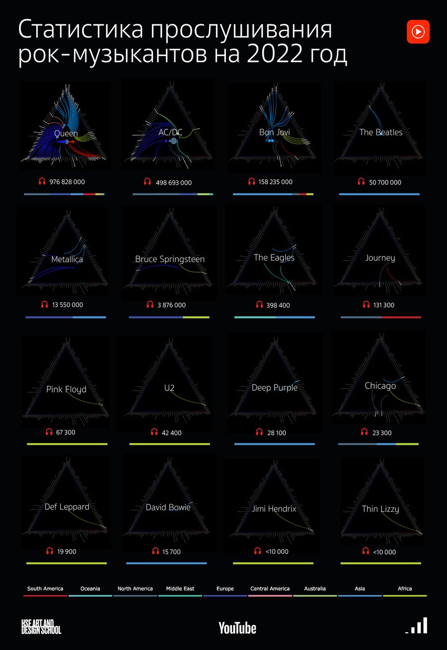 Серия плакатов исследует статистику наиболее и наименее прослушиваемых артистов по всему миру в 3-х разных жанрах: — рок — кантри — хип-хоп