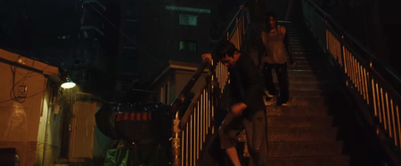 Наиболее четко мы видим, как далеко от дома семьи Пак находится дом семьи Ким, когда семья вторых сбегает из дома богачей в свой район под проливным дождем. Долгое расстояние показывается впервые, но также мы видим немалочисленные лестницы, ведущие от богатых районов к более бедным. Герои долго идут вниз, спускаются и спускаются.