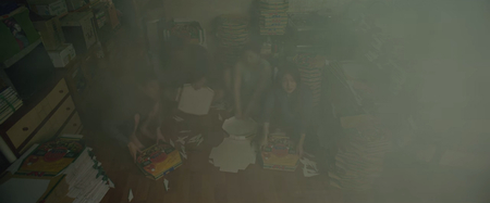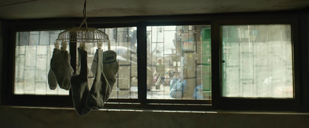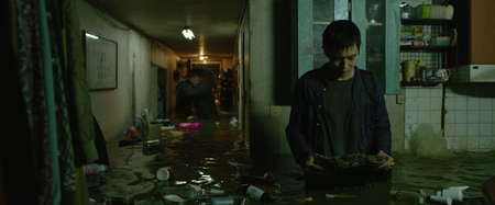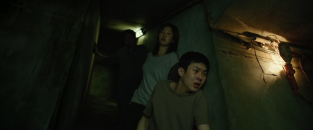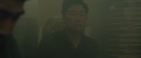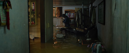 Подвал семьи Ким всегда окрашен в холодные, грязно-зеленые, сероватые оттенки, он лишен насыщенности цвета. Ведь это подвал, где всюду серые бетонные стены. Здесь не живут богатые люди, здесь видна бедность, здесь пахнет бедностью. Свет проникает лишь через небольшое продолговатое окно, ведущее на дорогу улицы. Естественного света очень мало, его еле пытаются заменить искусственные дешевые верхние лампы. Цвет отражает бедственное материальное положение семьи, а когда в подвал проникает газ зачистки от паразитов, цвет кадра становится совсем желтым, грязным и болезненным.