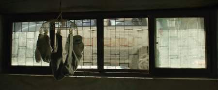 В домах обоих семей можно заметить повторяющиеся элементы, например, окна, которые имеют вытянутую форму. Однако в доме Паков это огромное панорамное окно с видом на сад, а в доме семьи Ким окно — лишь форточка с решетками, за которыми видны колеса проезжающих машин и ноги пьяниц по вечерам.