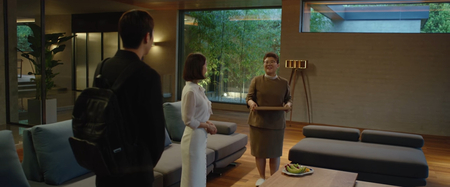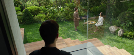 Возвращаясь к границам. Геометрия дома сохраняет некоторое расстояние между членами двух семейств. Однако герои из бедной семьи начинают приближать свое будущее в роскошном доме, сближаясь с детьми семьи Пак, по совместительству своими учениками, например, когда юноша обращает внимание на младшего сына миссис Пак. Теперь он может визуально пересечь разделяющую их линию.