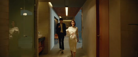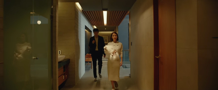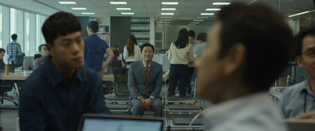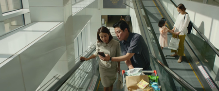 Еще один заметный кадр — из больницы во время того, как семья Ким пытается избавиться от экономки, подставив ее. Глава семьи медленно спускается по эскалатору вниз, так как из персонала высшего класса он опускается на уровень ниже, ближе к обыкновенной женщине-экономке, которую скоро, согласно плану семьи, уволят. Мошенничество не может равняться с высоким статусом в обществе.
