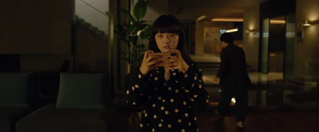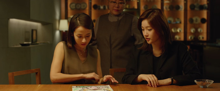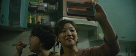 Сцена с устранением экономки делится на два акта: первый — подорвать почву, второй — нанести удар. Эта схема много раз отработана до идеала внутри семьи Ким, каждое действие обдумано и спланировано, что показывает синхронность выполнения плана в обоих случаях. Показывается это через похожие мизансцены. Порядок не случаен, время не случайно, зрители — тоже. Здесь телефон используется как место сбора компромата (на экономку).