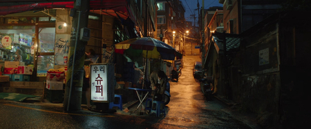 Напротив, район семьи Пак — светлый район, где можно увидеть растительность, даже свободно растущую на каменных стенах. Их участок большой и огражден сочными кустарниками и деревьями. Всю их семью окружает зелень, которая считается роскошью для более бедных классов.