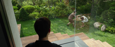 Знакомство отцов двух семей начинается также с разделяющей их полосы, однако появляется знакомое с начала фильма препятствие в виде стекла. Эта встреча — первая, границы сильны как никогда. Разделяющую вертикаль стекла видно с обоих ракурсов.