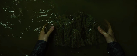 Вода выдает символизм камня, о котором будет упомянуто позже. Но с помощью нее мы видим, что тяжелый камень надежды всплывает в затопленной комнате, что значит, что он полый и не настолько ценный. В одной из последних сцен фильма, рассказывающей о планах юноши из семьи Ким, камень не всплывает и остается на дне, что говорит о нереальности такого будущего.