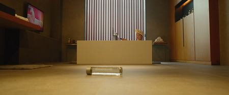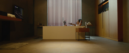 Когда семья Пак уехала на кемпинг, семья Ким решила обосноваться на время в их доме и примерить на себя жизнь богачей. Девушка получает комплимент от брата о том, что такая роскошная жизнь ей идет. Она действительно выглядит гармонично, так как кадр почти полностью повторяет кадр мистера Пака в своей ванной. Визуально люди из разных классов ничем не отличаются без своей одежды и с запахом чистоты.
