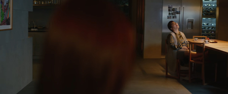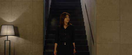 Ближе к концу фильма отец семьи Ким после совершенного убийства спускается по лестнице. На празднике он стал убийцей и теперь прячется в глубинах (далее он пойдет в подвал). Камера расположена сверху, и теперь мы можем проследить весь его путь, зная, куда ведут лестницы вниз.