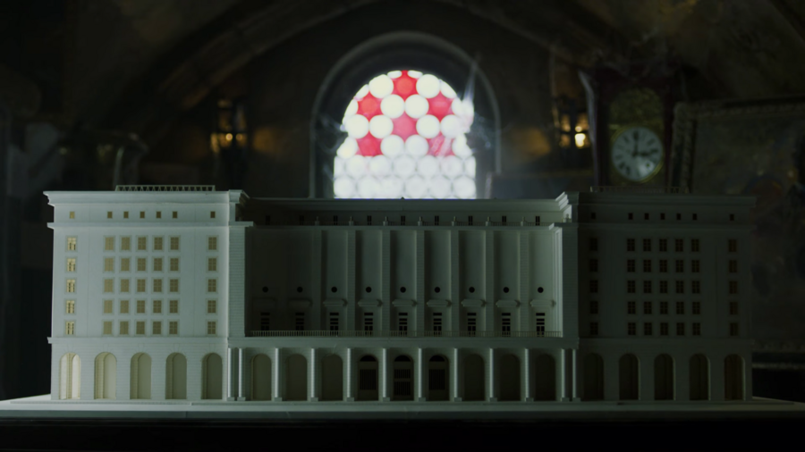 Во-вторых, агрессивный красный цвет вызывает физиологическое возбуждение и ассоциируется со страстью и жизненной энергией. Посреди умышленно созданной холодной и сдержанной палитры интерьеров, бетонной архитектуры и бюрократической стилистики государственных пространств, этот красный работает как визуальный взрыв, выделяя героев ещё сильнее.