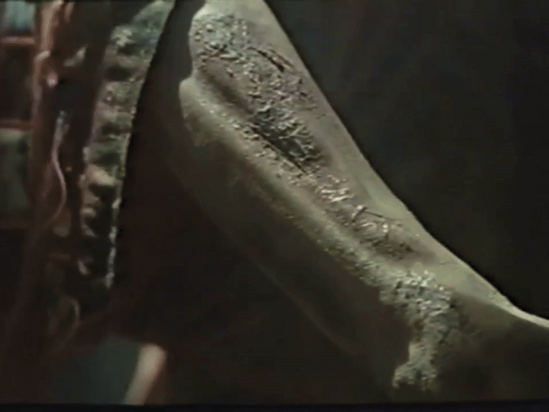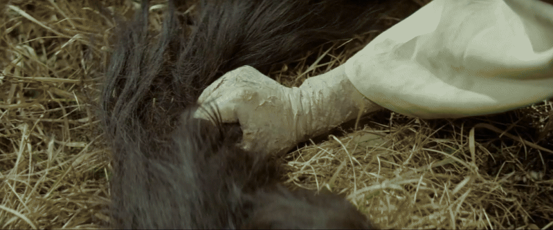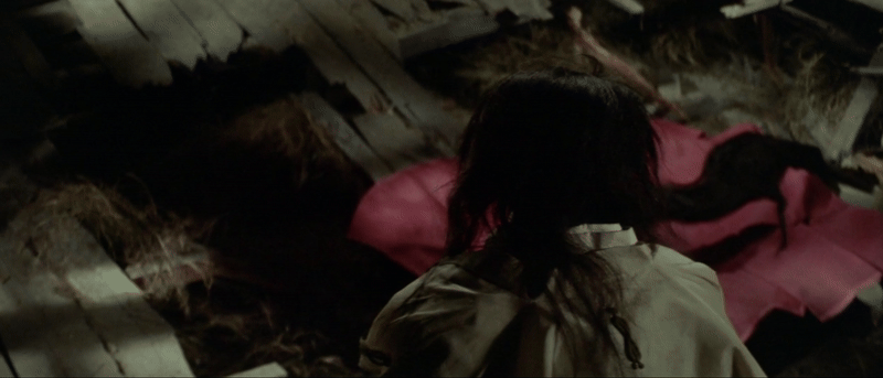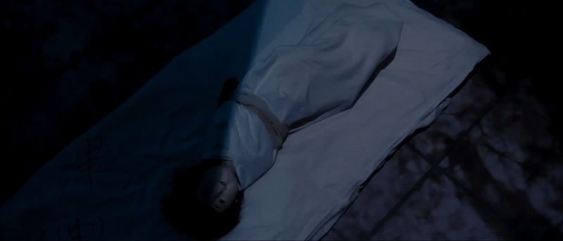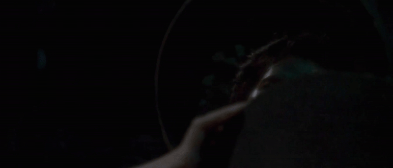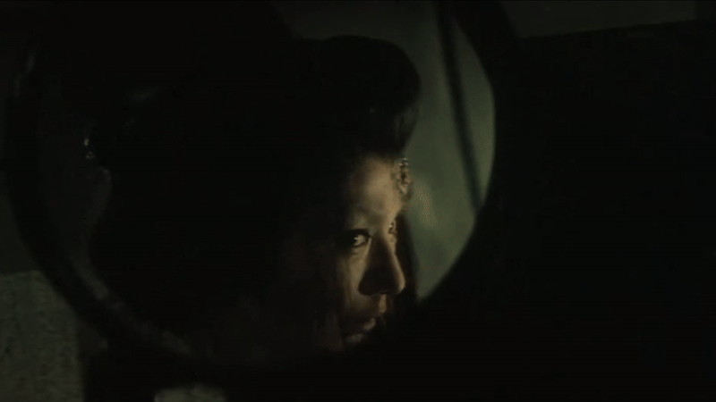Единственное световое решение, на которое я бы хотела обратить особое внимание, это кадр сверху слева: Оива смотрит в зеркало и замечает волдыри на своем лице. В момент поворота головы героини, неизуродованная половина её лица оказывается во тьме — её красота теперь ничего не значит, остаются только ужасающие раны, которые по сути отражают то, как муж и окружающие всё время воспринимали её — как гнойную рану, мешающую жить. Также я бы обратила внимание на зеркало: в привычной нам европейской традиции оно часто служит проводником между мирами, так что можно уже на этом кадре сказать, что героиня наполовину в могиле, темноте, поглощающей её. В верности этой трактовки я, конечно, сомневаюсь, однако, на мой взгляд, она имеет место быть.