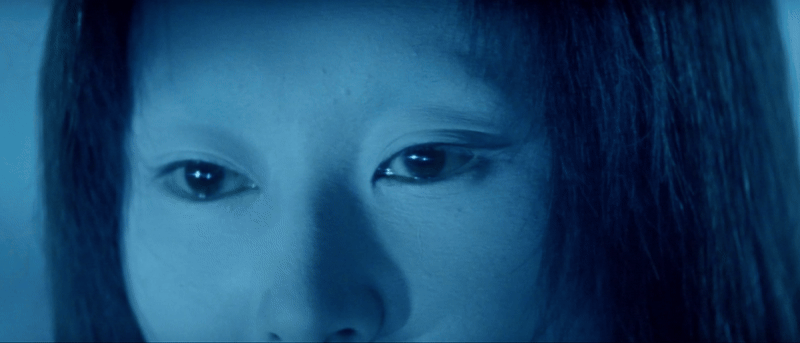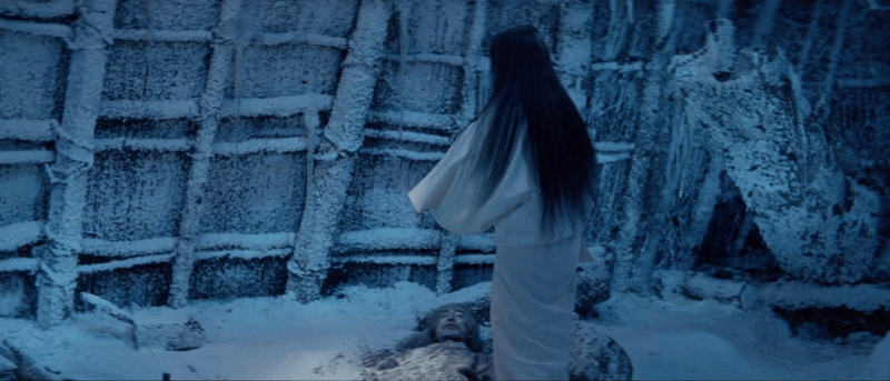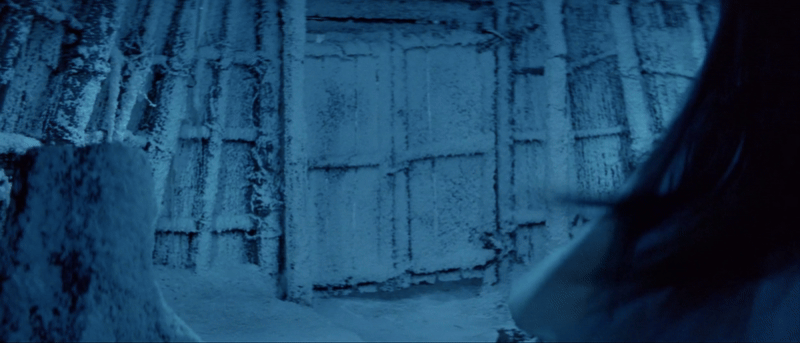 Когда в конце истории герой замечает в своей жене черты Снежной женщины, и она раскрывает свое истинное лицо, сцена из теплых приятных оттенков переходит в холодный синий. Особенно интересен сверхкрупный план лица: за счет изменения цвета и света (по-другому ложатся тени, становятся более резкими), оно сразу принимает более зловещий, холодный и отстраненный вид.