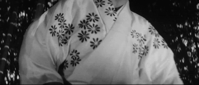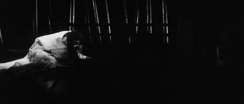 Стоит отметить, что с приходом сына, мать предстает в черном, а не белом кимоно; до этого момента оба призрака роковые соблазнительницы, однако воссоединение с сыном возвращает старшую в роль матери, которая переживает трагедию, а не мстит. Это кимоно — ещё одна цитата из Но: чёрное одеяние курагинами символизируют тень, скорбь, или скрытое чувство. Изменяется и проведение ритуала: в женщине больше нет решительности и хищности, а только скорбь; также на этом кадре танец показан сквозь бамбуковые заросли, в отличие от всех предыдущих, что говорит о потерянности женщины. Однако после смерти невестки, мать не хочет повторять её судьбу и зрители вновь видят образ в белом — с хитринкой и коварностью.