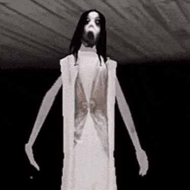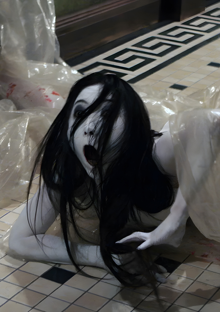 Визуально образ Каяко близок к Садако, однако кожа у нее уже совсем белая, а волосы уже не закрывают лицо, а наоборот, обнажают большие безумные глаза. В движениях Каяко уходит еще дальше, чем Садако: они становятся максимально неестественными из-за переломанных конечностей, напоминают судороги. Лично я испытываю самый сильный эффект зловещей долины именно от этого образа, особенно, если учесть то, что Каяко передвигается с характерным хрипящим звуком, по которому можно узнать её приближение.
