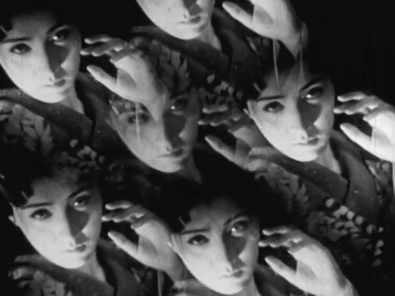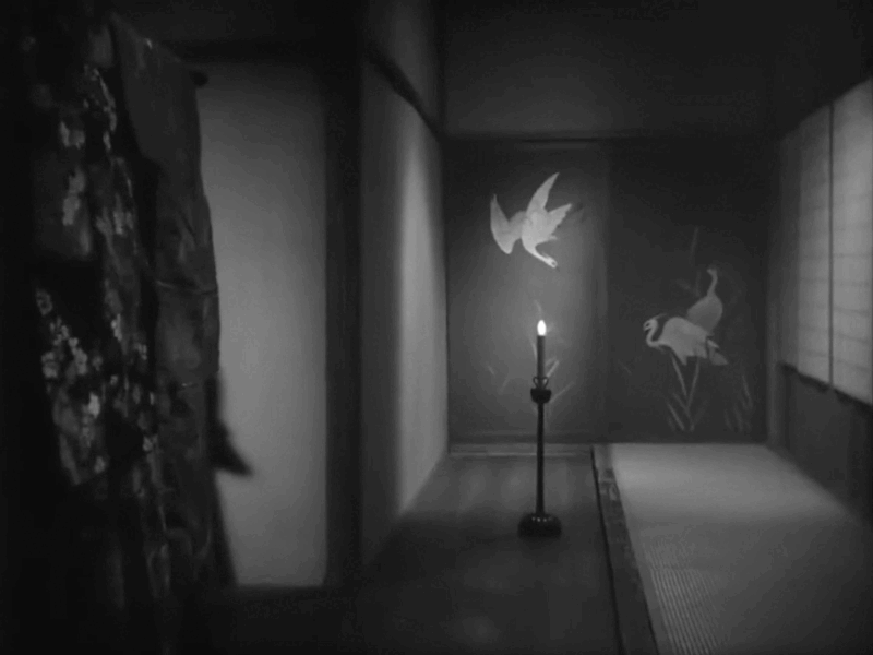 Другой интересный пример «Кот-призрак и таинственный сямисэн». Название фильма прямо говорит о том, что в этой истории присутствуют духи, однако при этом они не появляются напрямую, а присутствуют в звуковом сопровождении и в галлюцинациях главной героини (которая является виновной в убийстве двух девушек и кота, которые ее преследуют). Здесь призраки появляются в виде некой калейдоскопной полупрозрачной картинки, что скорее с точки зрения композиции и быстрой смены кадров роднит этот прием со «Страницей безумия», чем с последующими фильмами, однако эффект прозрачности и некой эфемерности это то, что будет широко эксплуатироваться в популярной мистике 1950-1960-х годов. И снова обращу внимание на танец: здесь он служит не только буквально представлением для зрителей, но также и своего рода ритуалом, во время которого призраки проявляют себя наиболее активно.