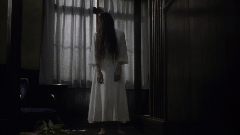 Очень примечательна первая сцена появления призрака: она предстает не как человек, а как облако черного густого дыма, что отсылает к буддийской традиции; кстати, это единственный образ (во всяком случае из этой выборки), где у духа отсутствуют ноги: это образ классического юрэй с гравюр, они абсолютно всегда изображались именно так.