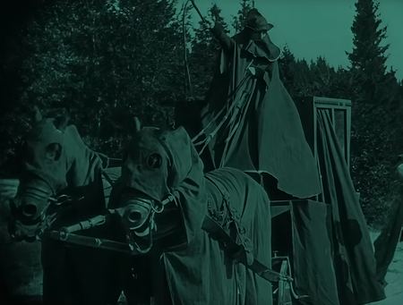 Такие малозаметные на первый взгляд детали, как кони, одетые в черные одеяния, словно призраки, которых не видно в темноте ночи, или часы-скелет со старинным циферблатом, также намекают зрителю о сверхъестественном происхождении их владельца.