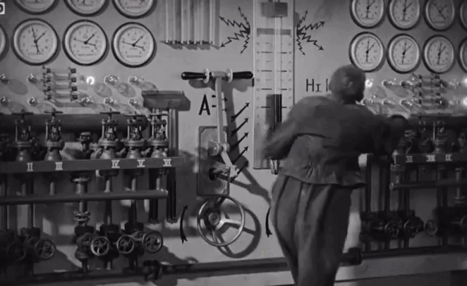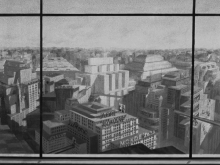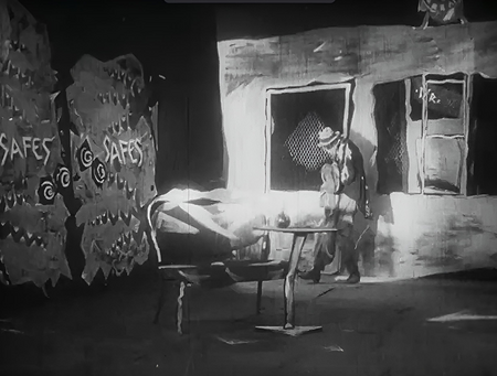 Первое место действия, которое фильм показывает зрителю — банк. Кадр можно поделить на три основных пятна, которые визуально дробят пространство: касса, пронизанная решетками, будто символизирующая заточение Кассира, большой сейф с нарисованными цепями и входная дверь. Такое чёткое разграничение создаёт впечатление тюремности, в которой работает главный герой, он словно сидит в «клетке» бюрократии. Намеренно высокие стойки банка показывают контраст между человеческим силуэтом и масштабом архитектурных форм, подчёркивая что Кассир всего лишь мелкий винтик в огромной системе, а не личность.