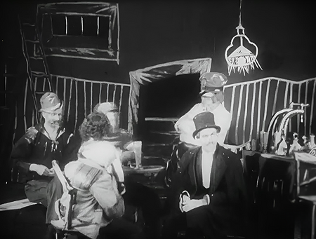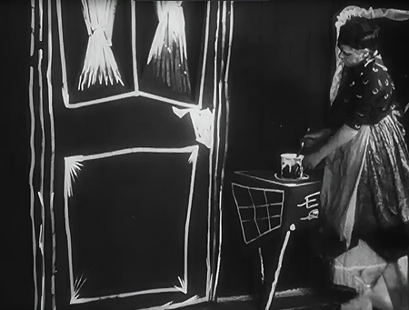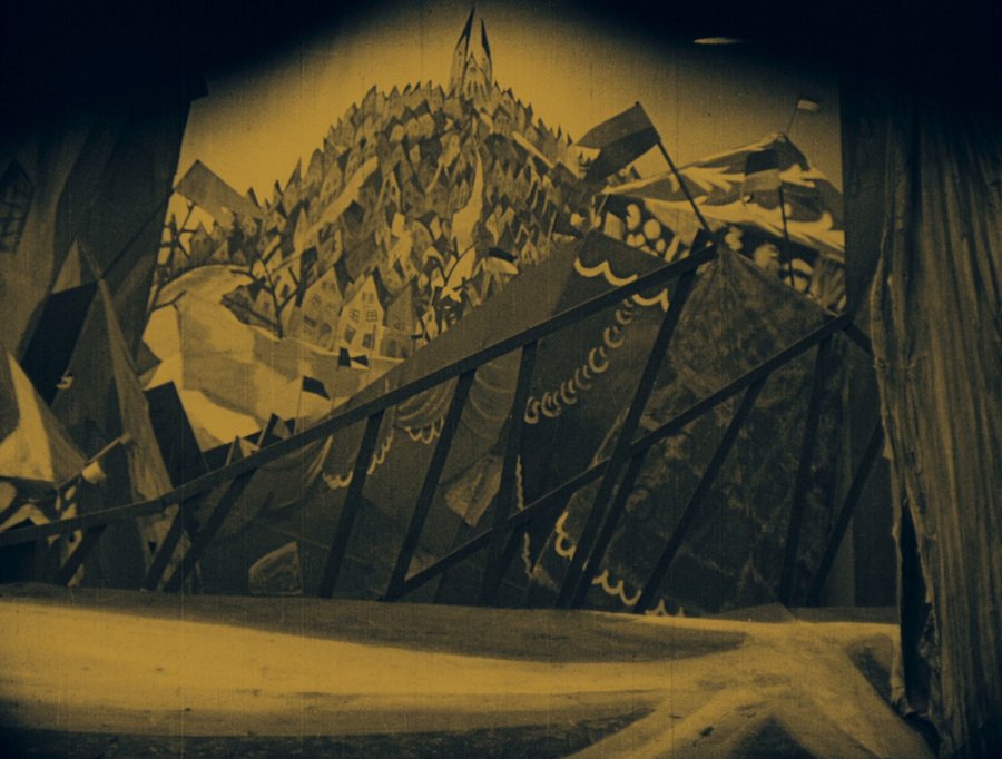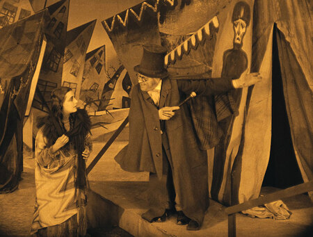 На кадрах с ярмаркой отчетливо читается этот подход. Если внимательно их изучить, то можно заметить, что большинство палаток обозначены схематичными полотнами, на окнах которых можно рассмотреть всю экспрессию штрихов, которую вложил художник, создающий детали. Лишь палатка доктора Калигари, возвышающаяся над другими, сделана из настоящей ткани, что иллюстрирует её важность на фоне остальных.
