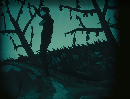 На фрагменте с Чезаре прямые формы в виде веток, тропинки, травы и наклонённых деревьев агрессивно указывают путь герою и всё ещё оставляют зрителя в немом напряжении. Силуэт человека будто бы сам становится частью пейзажа и рифмуется с деревьями: руки как ветки, а сам он пошатывается словно листья на ветру. Такое сравнение подчёркивает бессознательное и независящее от личных желаний состояние.
