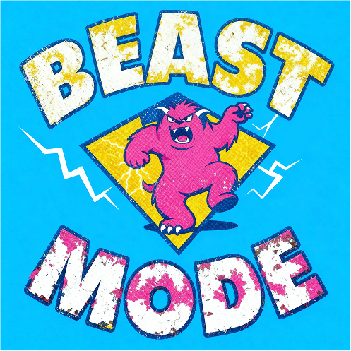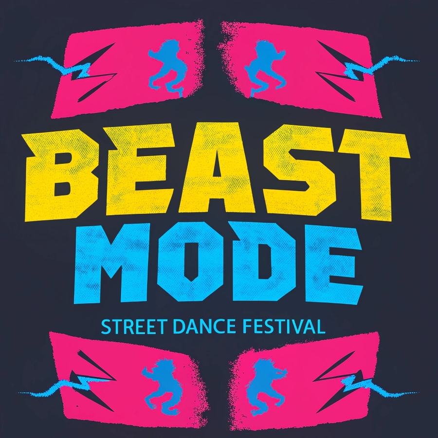 «Create a bold, eye-catching logo for 'BEAST MODE' street dance festival. Use a vibrant color palette with fuchsia pink and electric blue gradients as the base. The main text 'BEAST MODE' should be in a chunky, stencil-style font with sharp edges and a 3D effect. Integrate a stylized lion’s head (snarling, with detailed fur and teeth) into the letter 'O' of 'MODE, ' using gold and yellow tones for the animal motif. Surround the text with dynamic lightning bolts in contrasting colors (blue and yellow) to add movement. Add 'STREET DANCE FESTIVAL' below in a smaller, sleek sans-serif font with a subtle glow. Incorporate retro pop-art textures like halftone patterns or grainy overlays for a gritty, urban vibe. Keep the composition centered but energetic.»