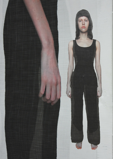 За основу я беру строительную сетку, на которой печатают фальшфасады домов в процессе постройки. Я изменяю способ ее применения, но оставляю форму. Тело уподобляется призрачному зданию, скрывающему за идеальным тканевым изображением неизвестность. Ожидаемый вариант тела размещен на сетке, но нахожусь ли внутри я?