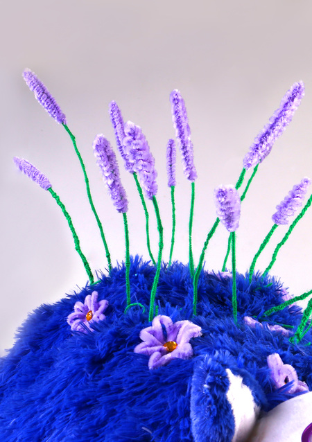 Моя текстильная скульптура — пушистый ёжик, на спине которого распустились цветы. Эта идея родилась в ответ на аномально затянувшуюся зиму: пронеся тепло сквозь продолжительную зиму, ёжик превращает холод своих синих колючек в почву для цветения. Это посланник весны, несущий жизнь и обновление сквозь стужу.