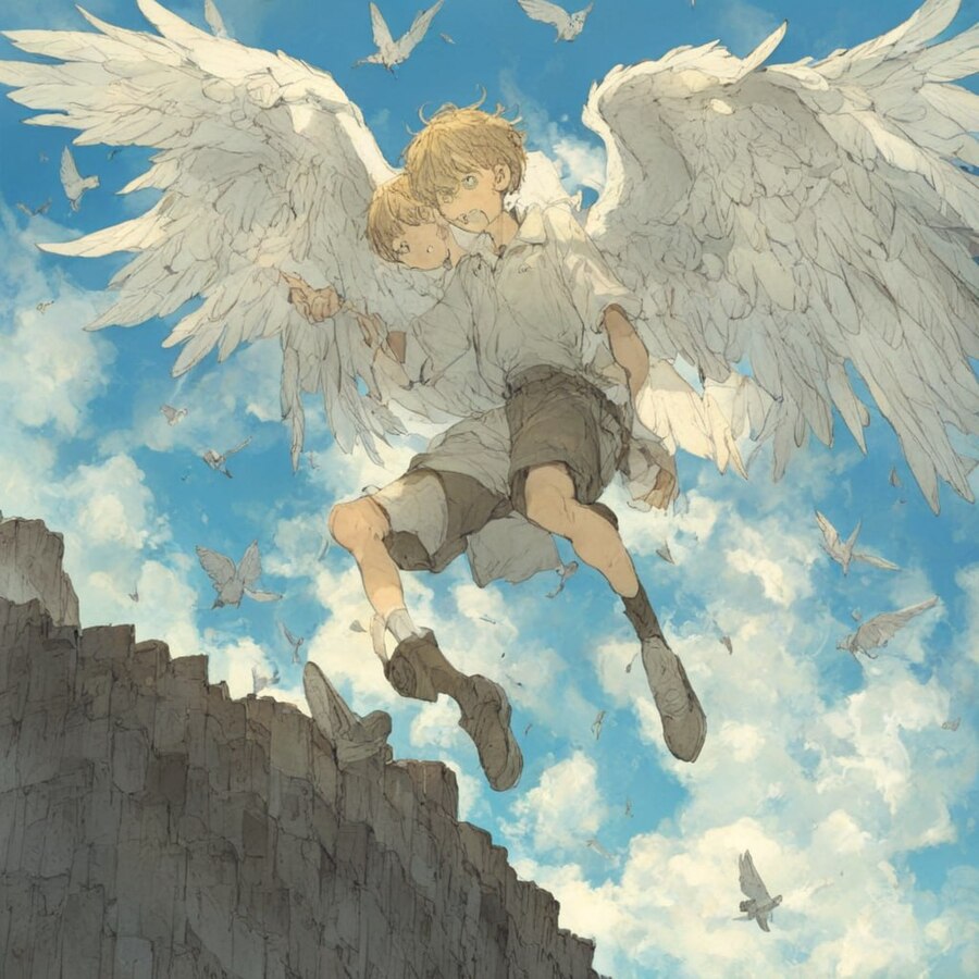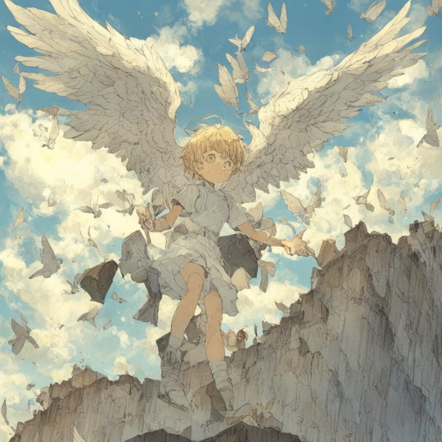 prompt: photo collage in Posuka Demizu style, an angel boy with a lot of wings falls from the cliff of the roof with bright blue sky