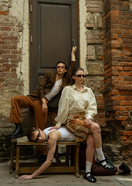 В этом модуле я решила создать фэшн-вселенную, где единственный инструмент для коммуникации между людьми — это их тело. Они не могут выражаться вербально и пересекаться взглядами, поэтому положение их тел в пространстве является единственным способом выразить мысль и что-то сказать.