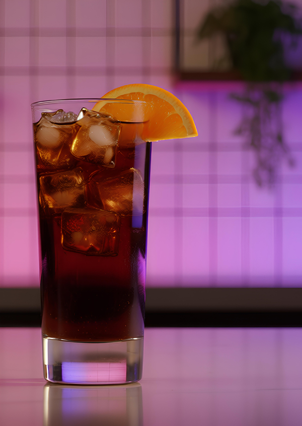 A realistic horizontal product photo of «Cuba Libre,» in the tall highball glass, filled with dark cola-brown liquid, ice cubes, and an orange slice on the rim. The background is a blurred interior with square tiles on the wall and some plants on the shelves. Neon pink-to-purple gradient lighting with ambient reflections. Style: realistic cocktail photography, glossy surface, warm cinematic lighting.