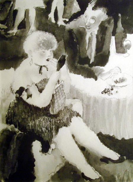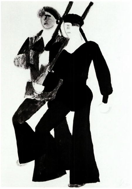 Силуэт девушки не имеет четкого контура и плотной заливки, легкое касание кисти художника придает этой серии настоящее движение. Художник стремится передать живое зрительное впечатление от двигающейся натуры.