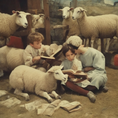 «painting in Parajanov style, kids reading books near sheep», «painting in Parajanov style, carpets on the ground»