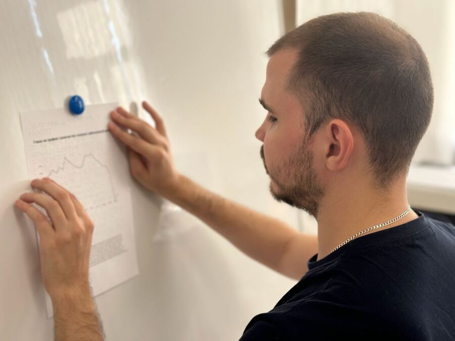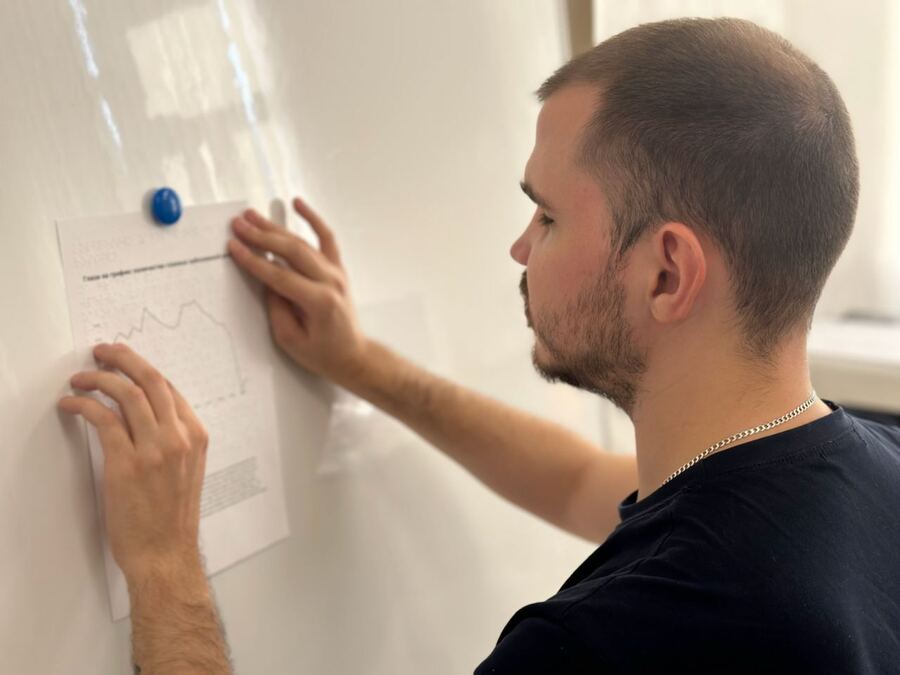 После печати материала на принтере Брайля, выверки расположения объектов, я провел тест графика. Для этого я пригласил Евгения Науменко — незрячего студента РГУ СоцТех.