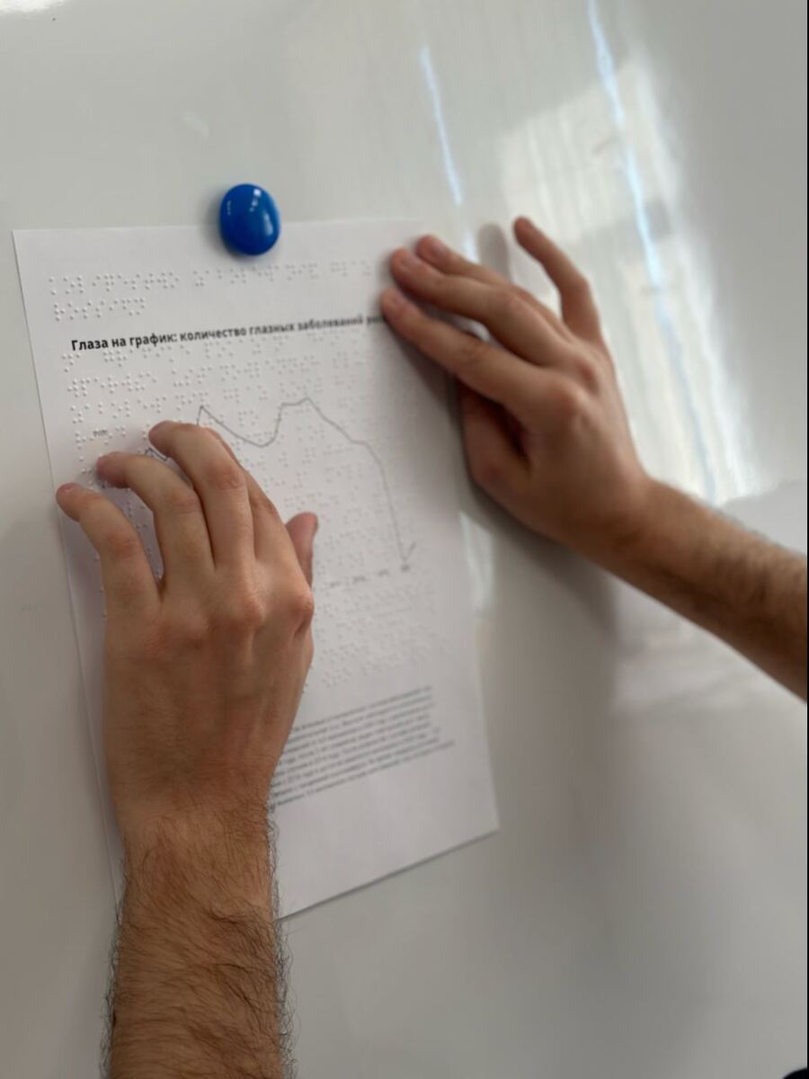 Тогда мне пришла идея — подготовить плакат про распространённость глазных заболеваний среди россиян. И совместить контент для зрячих (распечатанный текст с графиком) и незрячих (полное описание графика на Брайле).