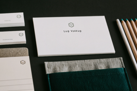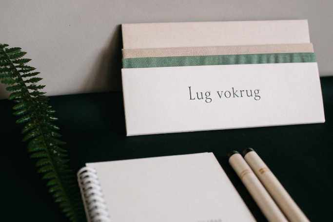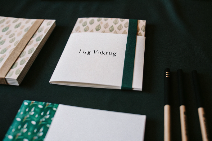 Stationery set for 'Lug Vokrug' on a plain, solid-color background. Eco-friendly design with soft, natural colors like beige, green, and brown. Subtle recycled paper texture for a sustainable look