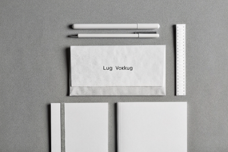 A clean, professional stationery set for 'Lug Vokrug' on a plain, solid-color background. Includes an A4 document template, envelope, business cards, and other branded materials. Minimalist, eco-friendly design with soft, natural colors like beige, green, and brown. Subtle recycled paper texture for a sustainable look, with soft, even lighting.