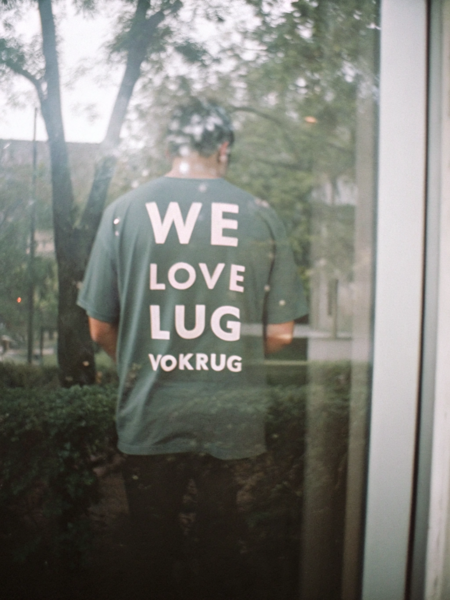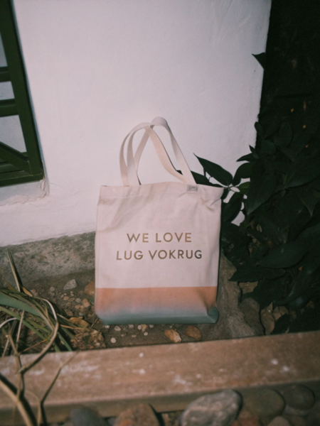 1\. Tote bag with the text 'WE LOVE LUG VOKRUG' in a handwritten font style. Soft, earthy tones like beige, muted greens, and warm browns. Made from recycled fabric with a simple, organic design 2\. T-shirt with the text 'WE LOVE LUG VOKRUG' in a handwritten font style. The model is standing behind a glass window, with soft reflections adding depth. Shot in a film-style aesthetic with soft lighting, slight grain, and a warm, natural atmosphere.