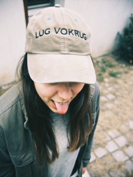 2. A beautiful young woman wearing a cap with the text 'LUG VOKRUG' logo in a handwritten font with a tulip icon. She is playfully making a funny face, adding a lighthearted and natural feel. The cap is in soft, earthy tones like beige, olive, or muted green.