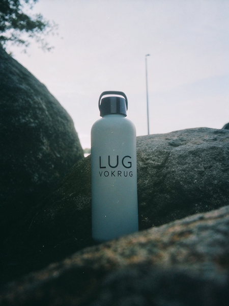 1. A reusable bottle with the 'LUG VOKRUG' logo in a handwritten font. Minimalist, eco-friendly design in soft, natural tones like beige, green, or frosted glass. The bottle has a simple, organic look with subtle texture, photographed with soft natural lighting and a slight film-like grain for a cozy, authentic feel
