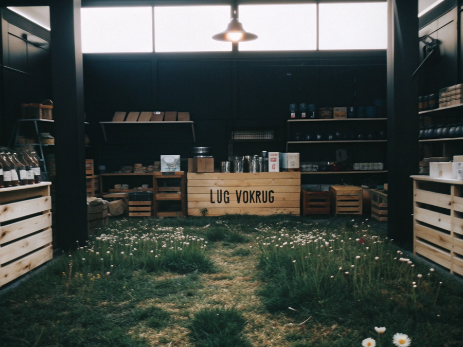 A small, nature-inspired pop-up stand inside a grocery store, designed as a miniature meadow. A compact area with a patch of grass and scattered wildflowers, surrounded by wooden crates and shelves displaying 'Lug Vokrug' eco-friendly products like seed-paper tableware and reusable bottles. The rest of the store remains unchanged, with the pop-up acting as a cozy, inviting natural corner. Soft, warm lighting enhances the organic feel, and a simple, handwritten 'Lug Vokrug' sign completes the look